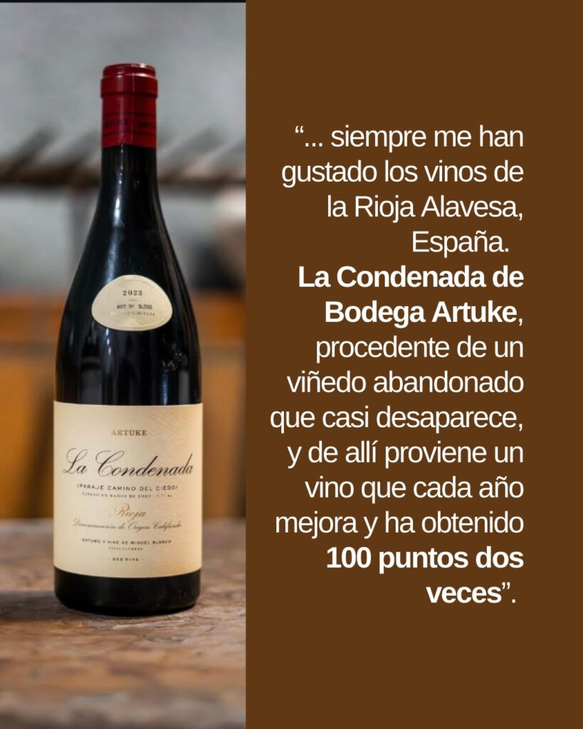 Luego, siempre me ha gustado los vinos de la Rioja Alavesa, España. El vino La Condenada de la Bodega Artuke @arturoartuke procedente de un viñedo abandonado que casi desaparece, y de allí proviene un vino que cada año mejora y ha obtenido 100 puntos dos veces. Se trata de una mezcla de campo y esto es interesante porque cada me gustan más los blends que los varietales. Claro, hay sus excepciones. Pero los blends son más complejos, en especial, si tienen variedades blancas que le aportan frescura.