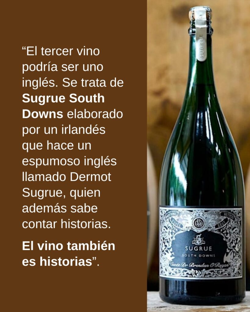 El tercer vino podría ser uno inglés (risas). Se trata de Sugrue South Downs @sugruesouthdowns elaborado por un irlandés que hace un espumoso inglés llamado Dermot Sugrue, quien además sabe contar historias y el vino también es historias».