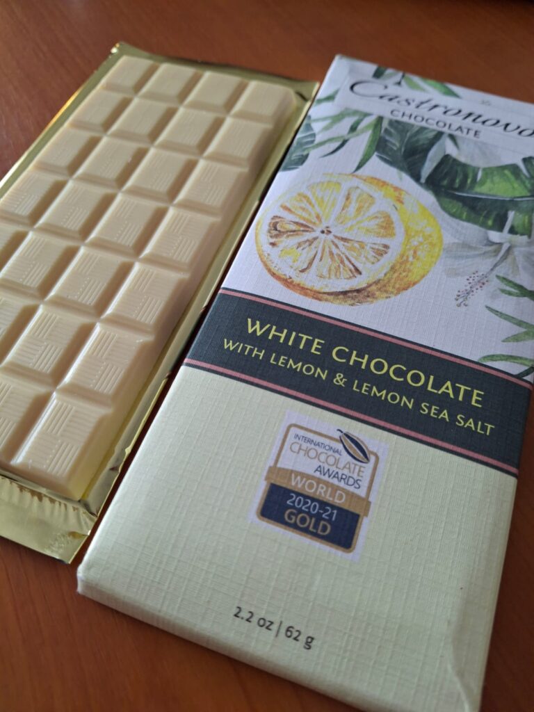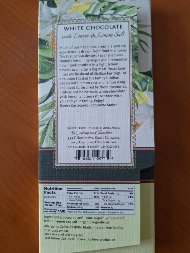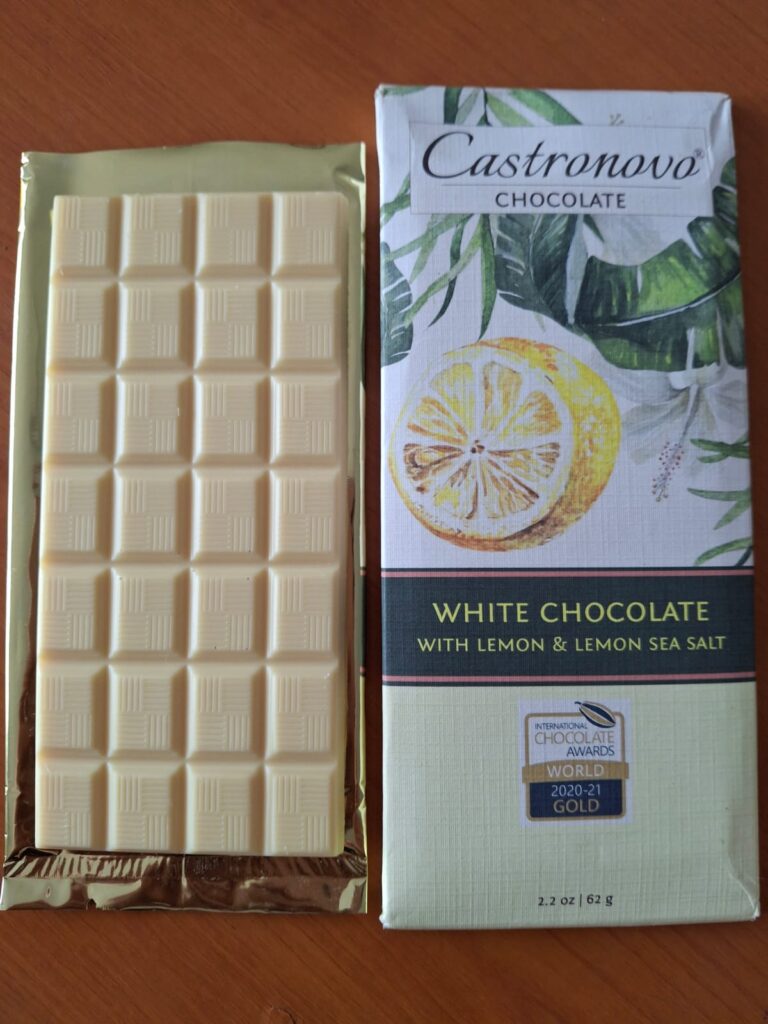 Esta reseña la protagoniza la tableta de Castronovo Chocolatecon limón y sal marina, elaborado en Florida, Estados Unidos por la chocolatier Denisse Castronovo. Su trabajo me flechó en 2019 cuando estuvo en el Salón del Cacao y Chocolate peruano representando a su país que fungía de invitado.